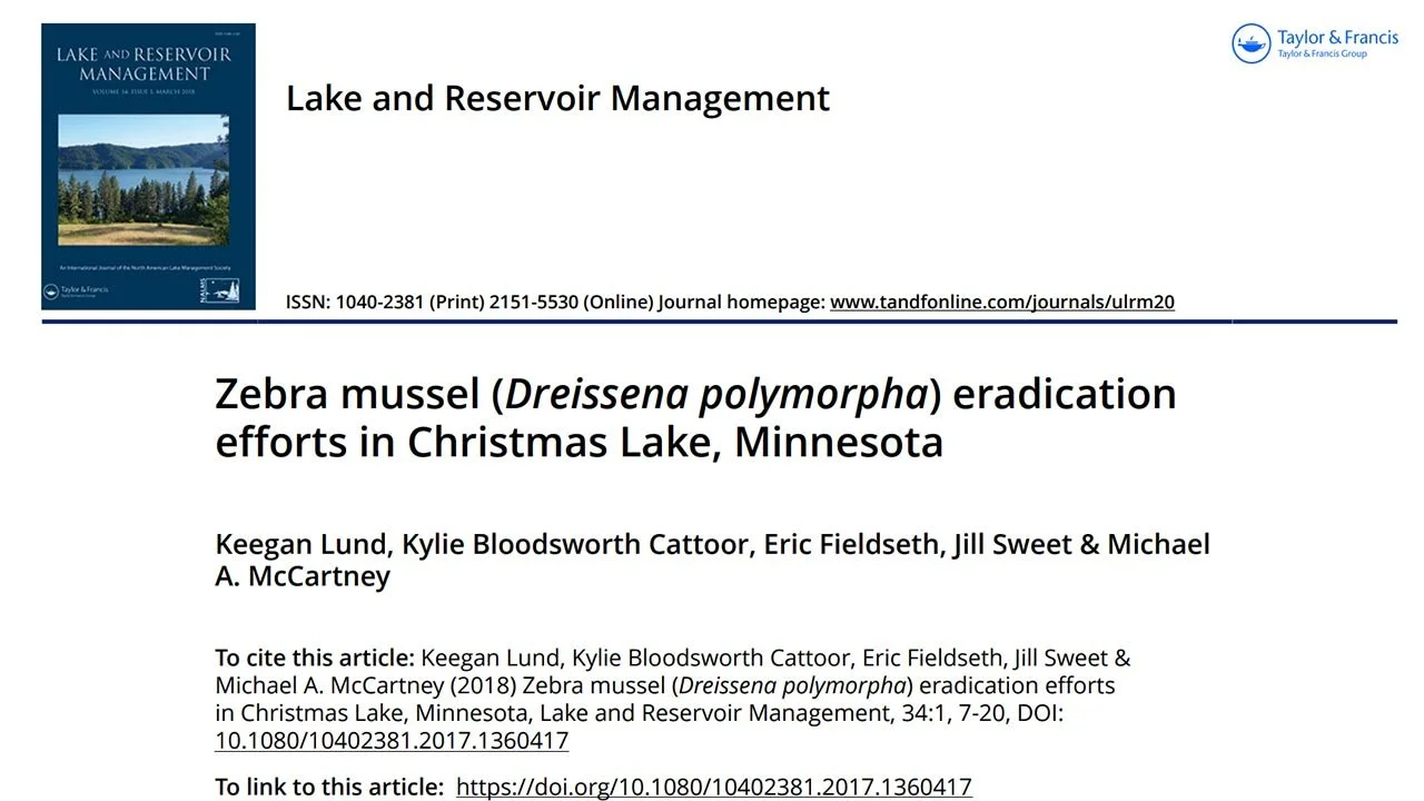 The study “Zebra Mussel (Dreissena polymorpha) Eradication Efforts in Christmas Lake, Minnesota,” published in Lake and Reservoir Management, documents one of the most comprehensive and ambitious zebra mussel control efforts in open freshwater. In 2014, an early-detection program discovered a small infestation near a public boat ramp in Christmas Lake, a clear, spring-fed lake near Lake Minnetonka. Rapid response followed with the application of three molluscicides—Zequanox, EarthTec QZ, and potash—each applied in partial-lake treatments over multiple seasons.
